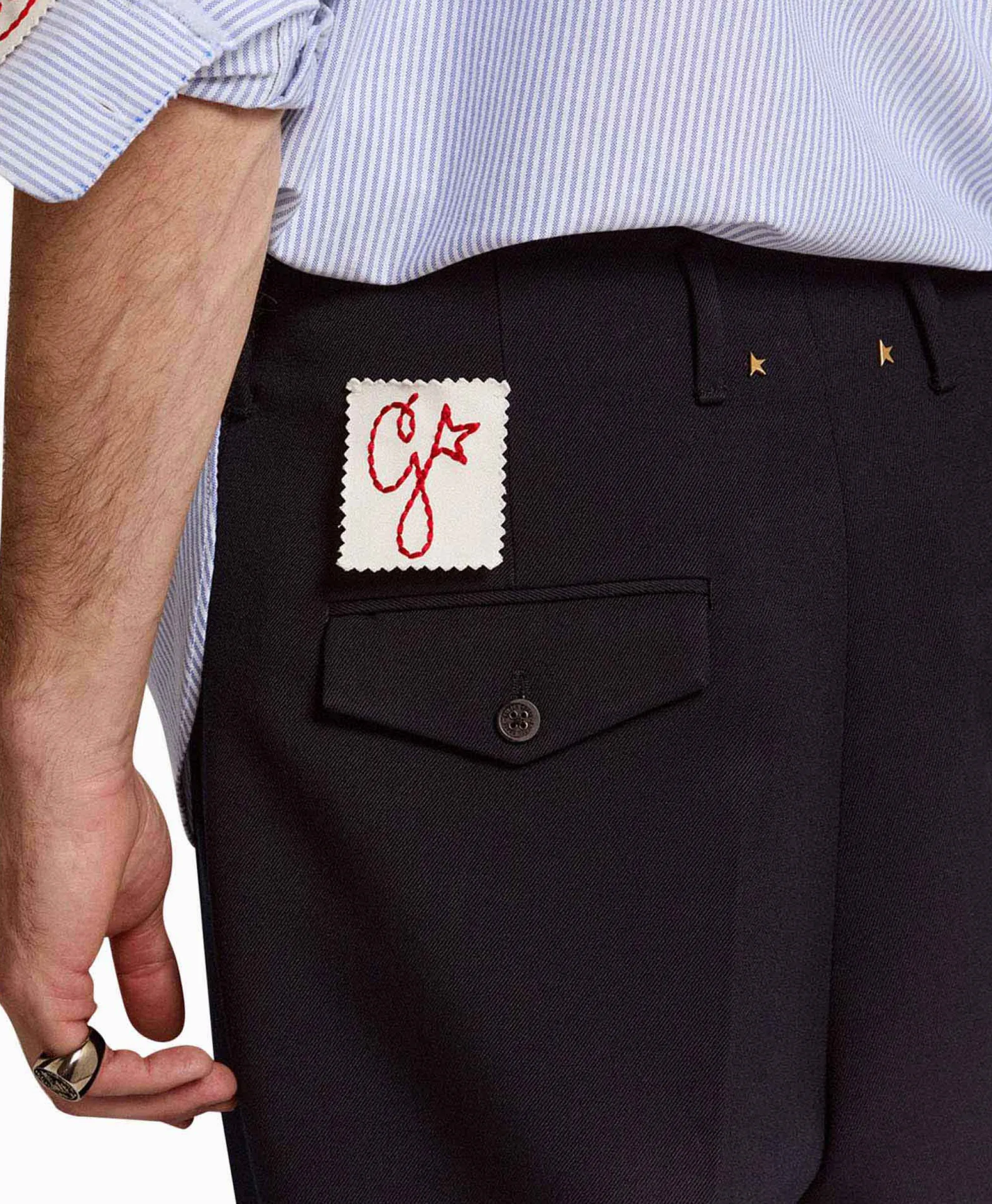 Een Unieke, Tijdloze Collectie Die De Essentie Van Golden Goose Omvat, Ontworpen Om Elke Dag Te Dragen. Deze Donkerblauwe Wollen Broek Heeft Wijde Pijpen En Coupenaden Aan De Voorkant. De Afneembare Witte Patch Met Een Fijn Geborduurde Letter G In Rood Maakt Het Geheel Af. Hoofdmateriaal: 66% Polyester En 34% Scheerwol