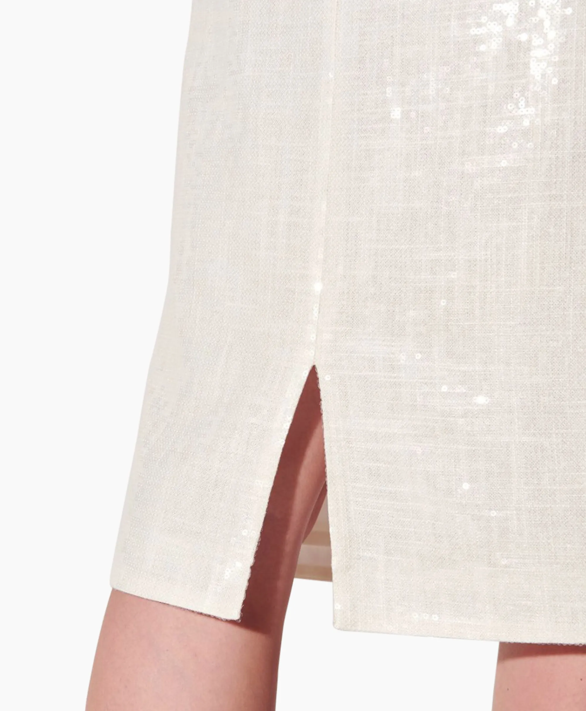 Knielange Kokerrok Met Splitdetail Aan De Achterkant. De Transparante Pailletten Op De Viscose-Linnen Stof Creëren Een Glamoureus Glinsterend Oppervlak. Ons Model Is 178 Cm (5’10 Ft) Lang En Draagt Maat 36. Materiaal: 70% Viscose, 30% Linnen, 43% Polyester.