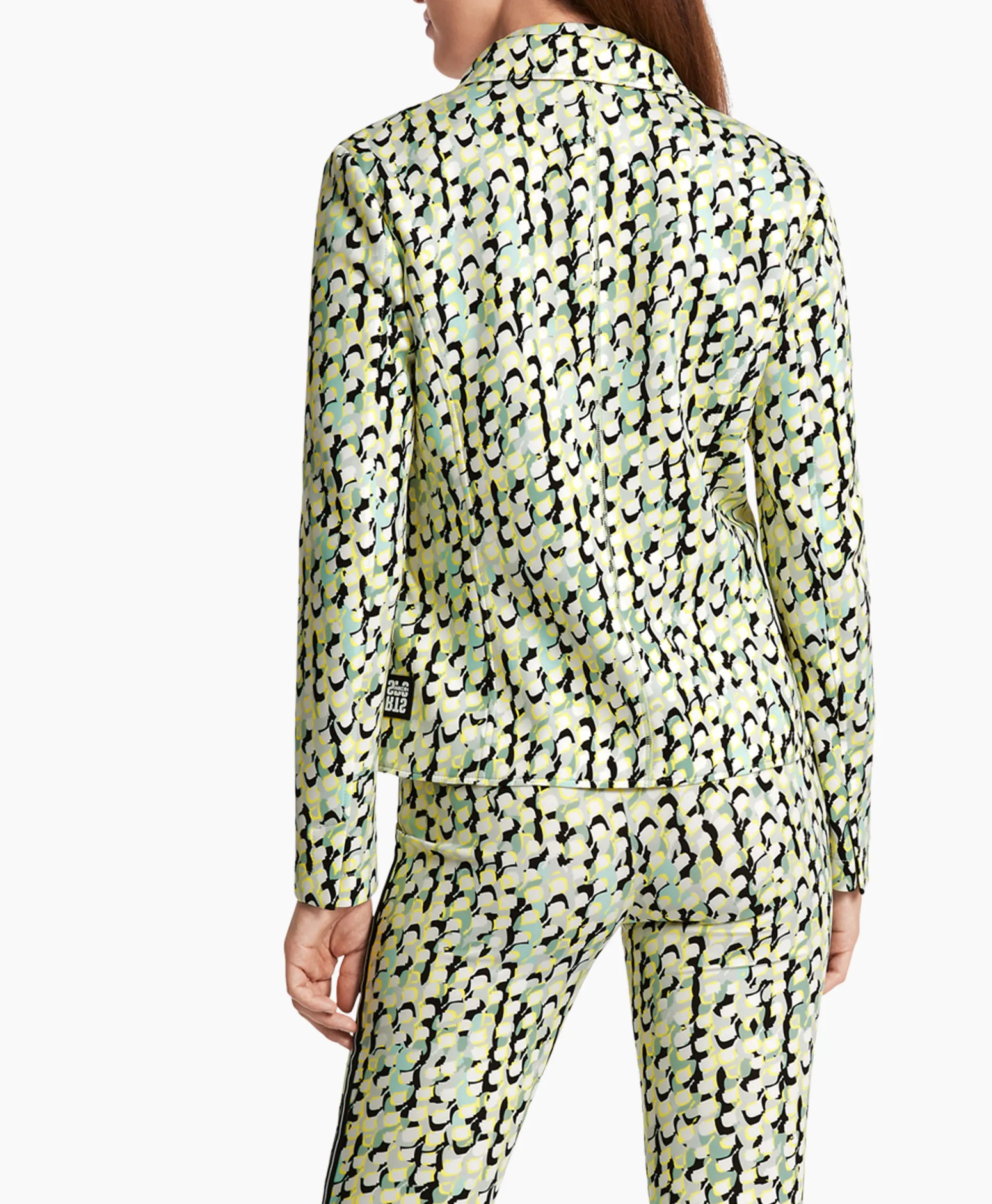 De Blazer Is Van Zachte En Flexibele Jersey. De Vorm Is Nauwsluitend En Gemodelleerd Met Weense Naden. Het Model Heeft Een Vallende Snit En Één Rij Knopen. Very Seventies: De Opgestikte Zakken En De Grafische All-Overprint. Stijlvol Contrast: De Gestreepte Boord In De Zijnaad. Het Model Is 179 Cm Lang En Draagt Maat N3 / 38. Materiaal: 100% Polyester, 27% Elastaan, 87% Polyester.