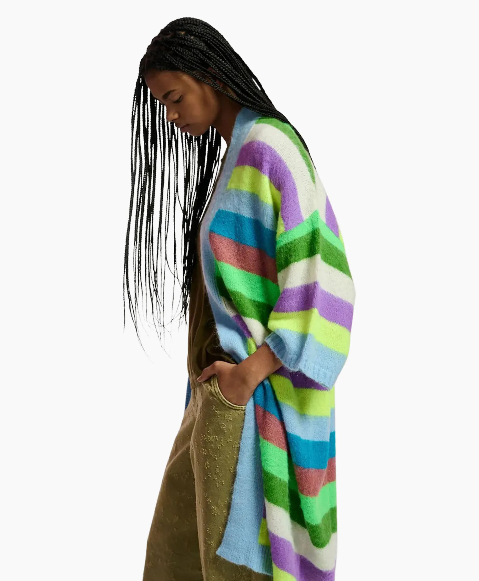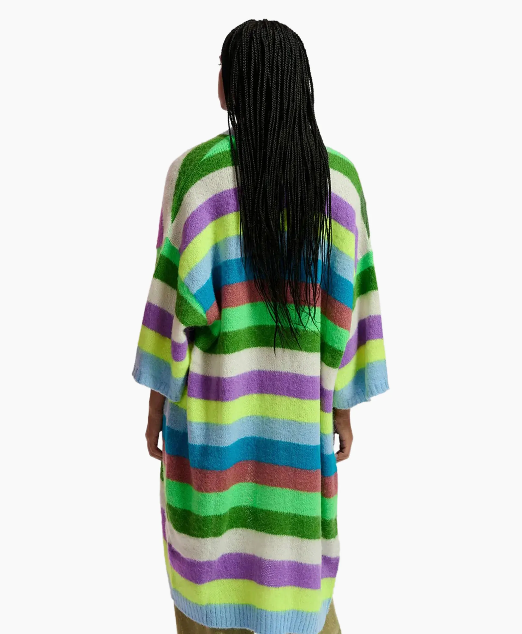 Vernieuw Jouw Stapel Gebreide Basics Met Onze Kleurrijke Cardigan Met Strepen. Hij Is Ontworpen In Een Relaxte Lange Pasvorm Met Lage Mouwinzet Die Je Makkelijk Over Een T-Shirt En Jeans Kunt Aantrekken. 45% Acryl; 35% Polyamide; 20% Alpaca Wol. Het Model Is 179 Cm Groot En Draagt Een Maat S.