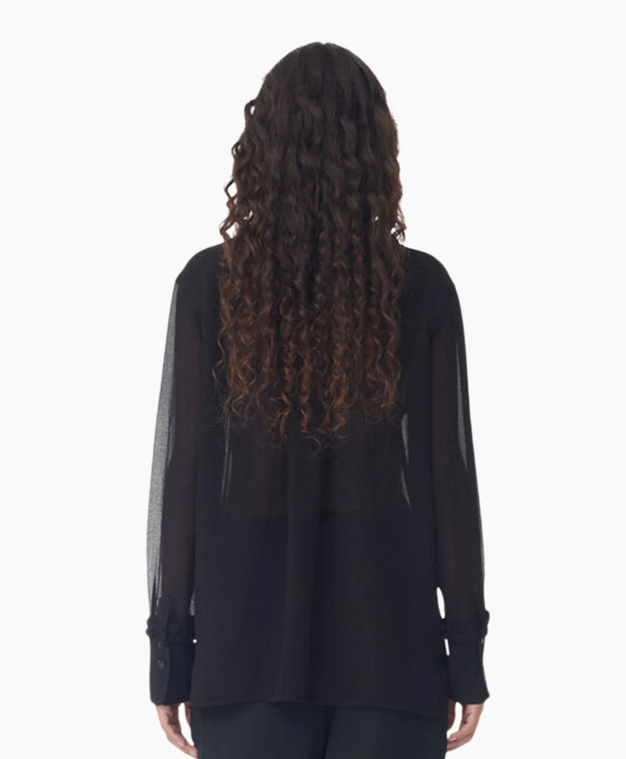 Dit Zwarte Chiffon Overhemd Met Ruches Is Gemaakt Van Gerecycled Polyester. Het Overhemd Heeft Een Normale Pasvorm En Is Voorzien Van Een Kraag, Knoopsluiting, Ruches, Gebogen Zijsplitten En Manchetten Met Knopen.&Nbsp;
