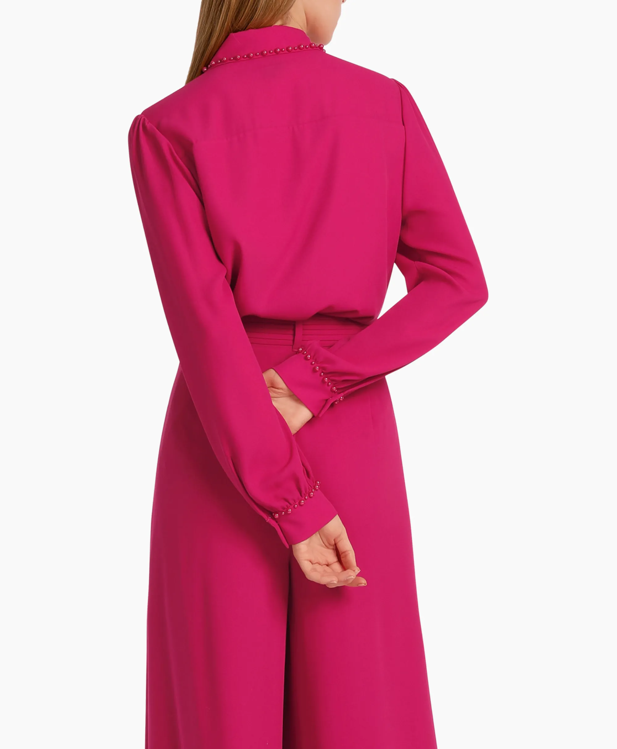 Losjes Gesneden, Iets Transparante Blouse Van Gerecycled Materiaal. De Eyecatchers Bij Deze Overhemdblouse Zijn De Met Parels Bezette Kraag En De Mouwen Met Manchetten, Eveneens Met Parels Bezet. Het Rechte Model Wordt Afgestyled Met De Bedekte Knoopsluiting.Het Model Is 179 Cm Lang En Draagt Maat N3 / 38.&Nbsp;