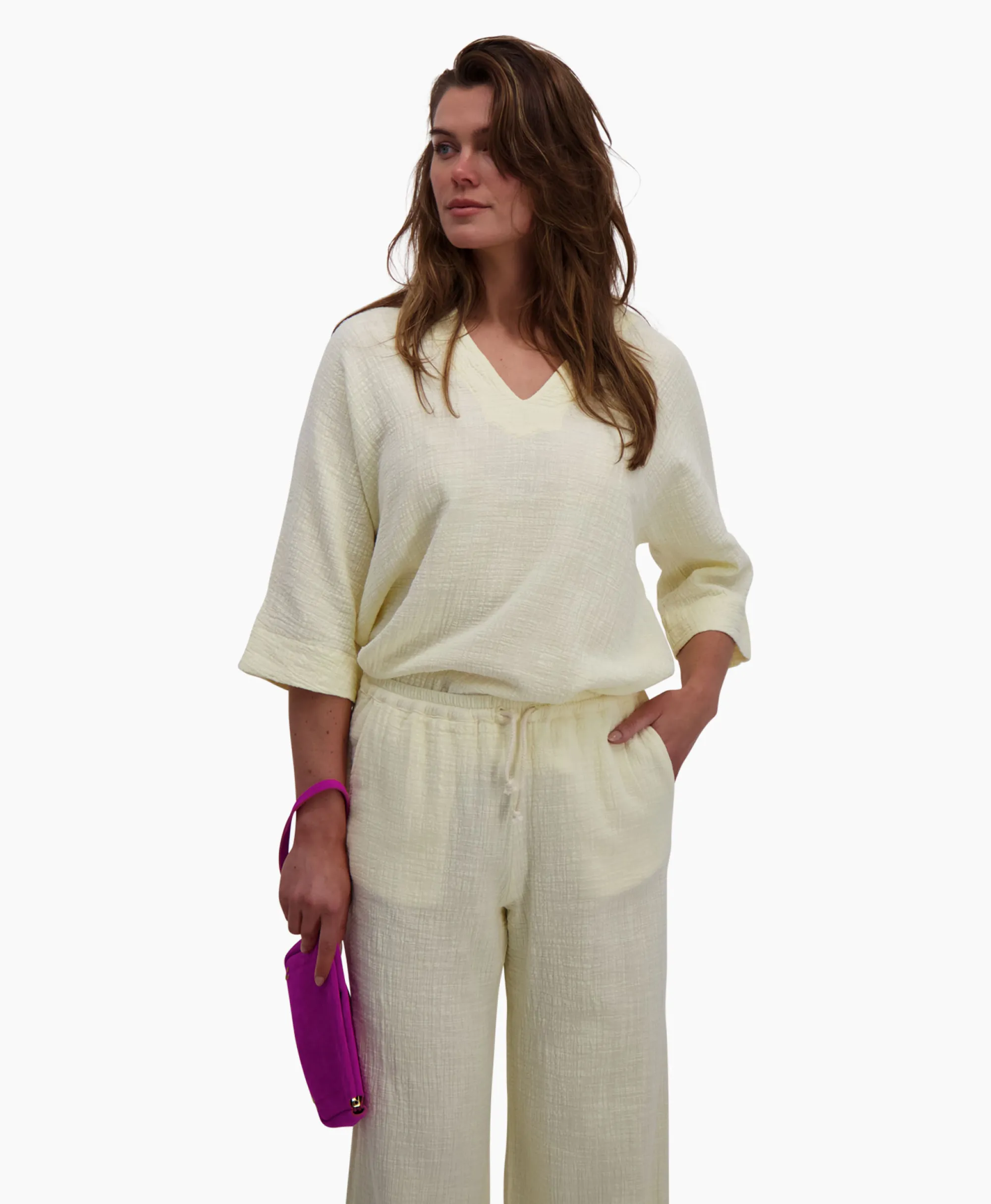 Ontdek De Tijdloze Eenvoud Van De Myla Top, Een Essentieel Kledingstuk Voor Elke Garderobe. Gemaakt Van 100% Katoen, Biedt Deze Top Niet Alleen Comfort, Maar Ook Een Klassieke Uitstraling Die Makkelijk Kan Worden Gestyled. Met Een Elegante V-Hals En Stijlvolle 3/4 Mouwen Is De Myla Top Perfect Voor Casual Gelegenheden.